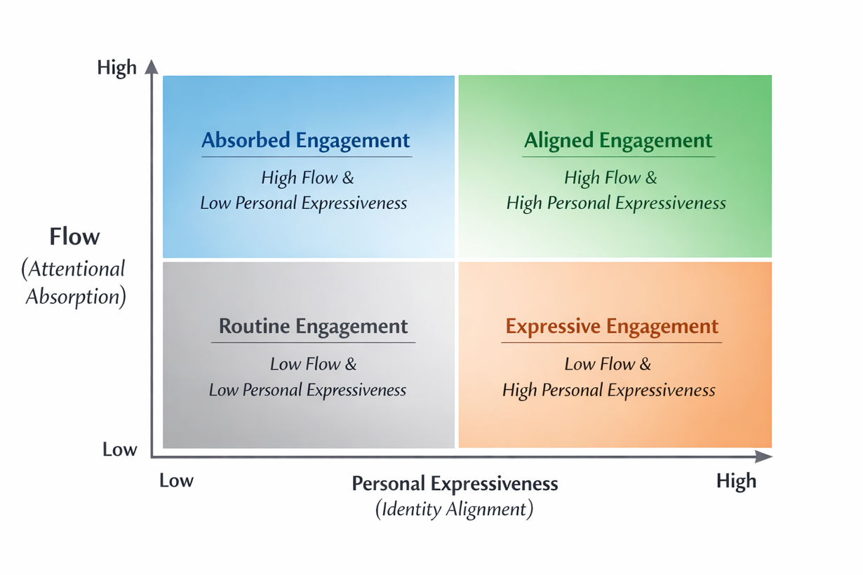 The Quadrant Model of Aligned Engagement explains how everyday activities differ in the degree to which they feel both absorbing and personally meaningful. The model integrates insights from flow theory and eudaimonic identity theory, proposing that a distinct form of experience (aligned engagement) arises when focused attention and identity alignment occur together. Research using experience sampling methods suggests that these moments that are high in both flow and personal expressiveness are associated with the most positive experiences and may play an important role in how individuals experience repeated positive engagement in everyday life.
